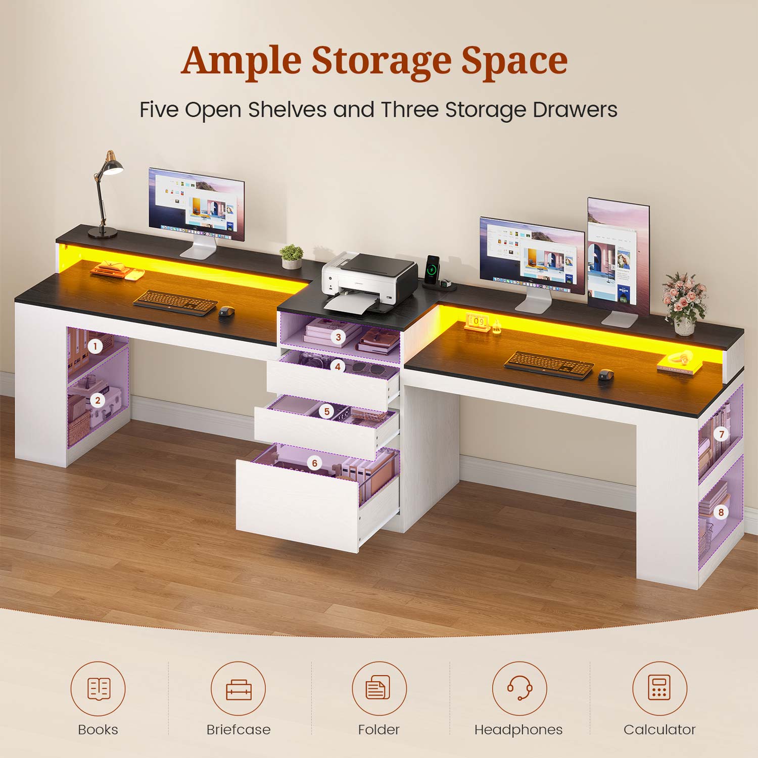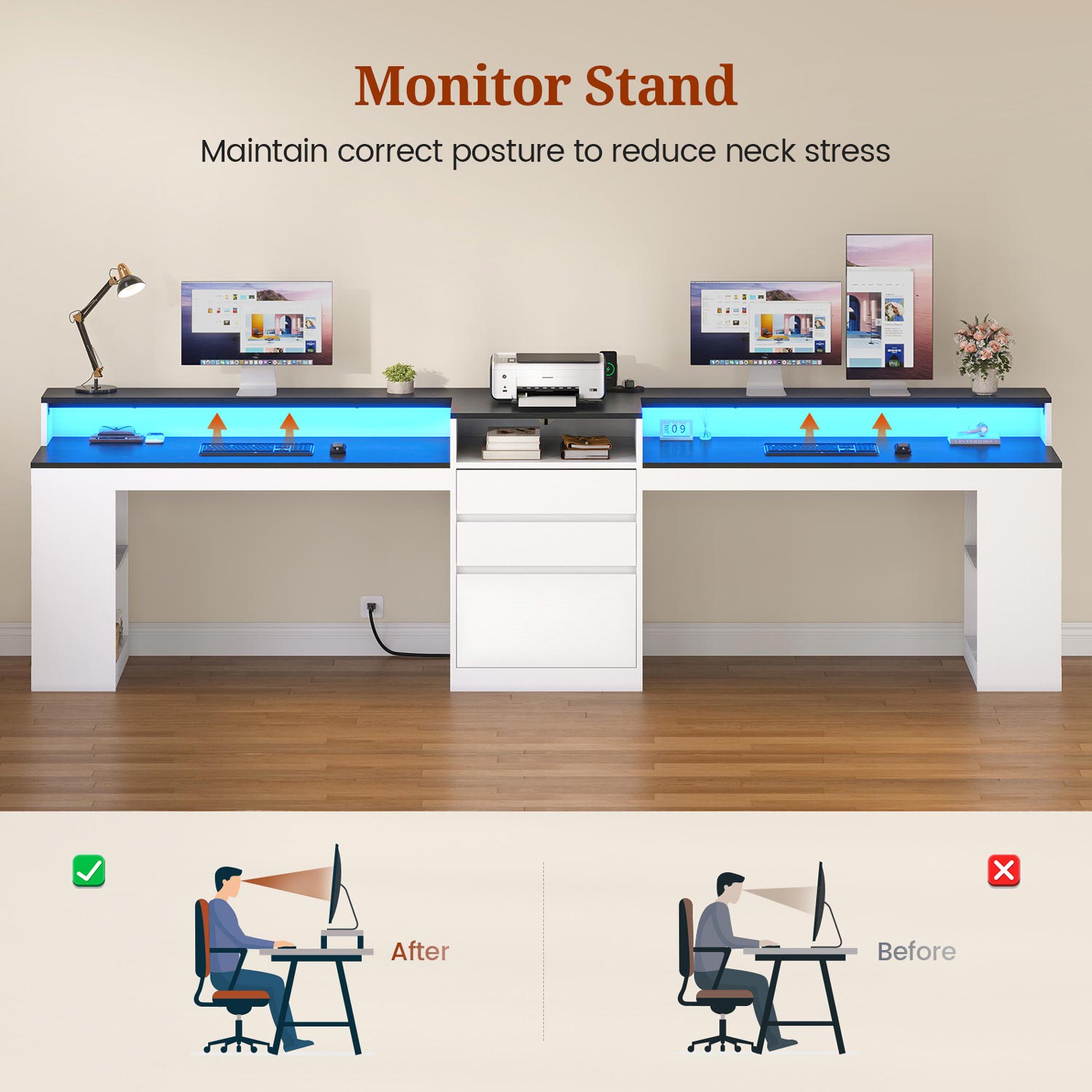 【96.6" Long Computer Desk】The 96.6" L x 19.7" W extra large desktop offers generous space to hold 4 monitors, keyboards, gaming setups, files, etc., keeping everything easy to access. It can be used as 2 person desk, home office desk or gaming desk, making it convenient for two people to work and play games at the same time.