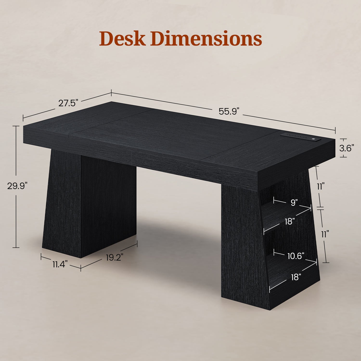 55.9" Executive Desk with Power Outlets & Open Storage Shelves Black