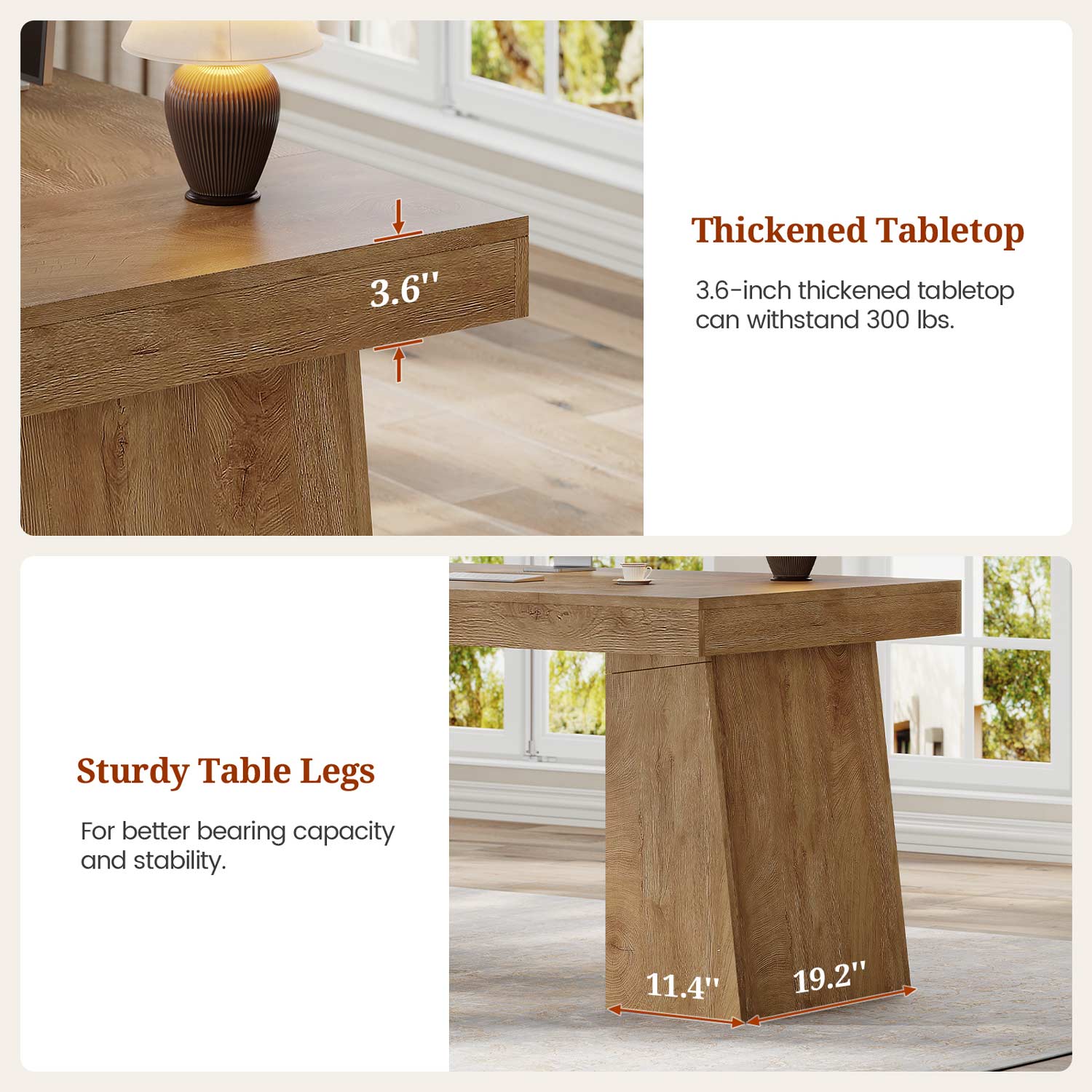 The thickened tabletop can withstand 300 lbs. The high-quality wood surface has an embossed texture, which adds a sense of refinement and is more durable.