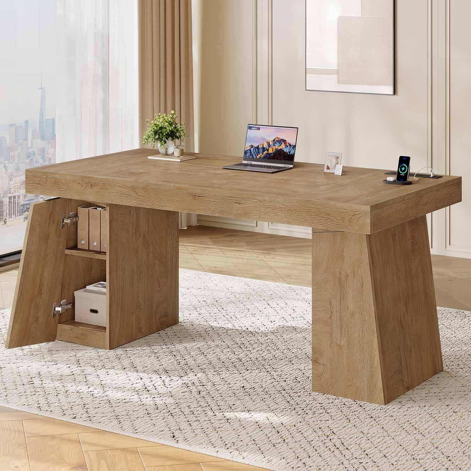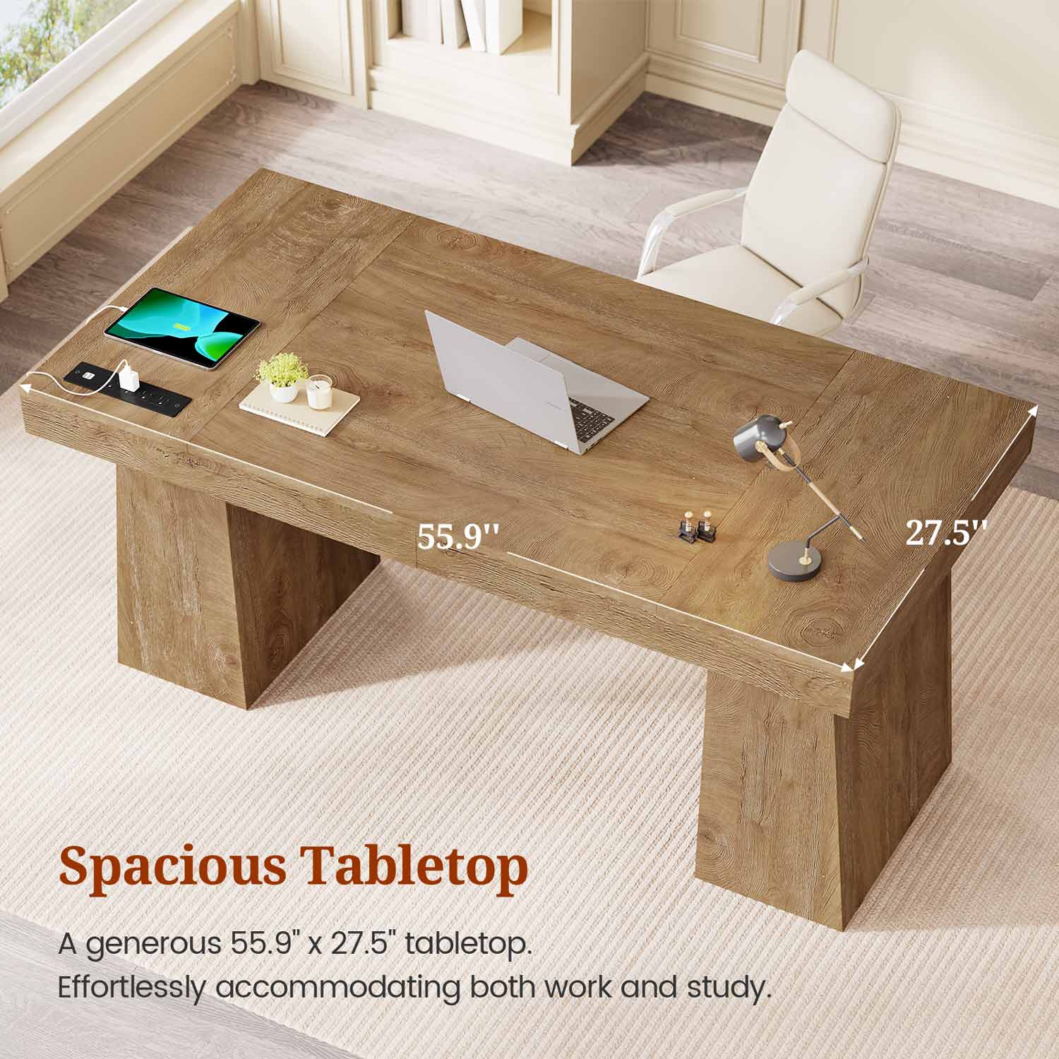 55.9" Executive Desk with Power Outlets & Storage Shelves Oak