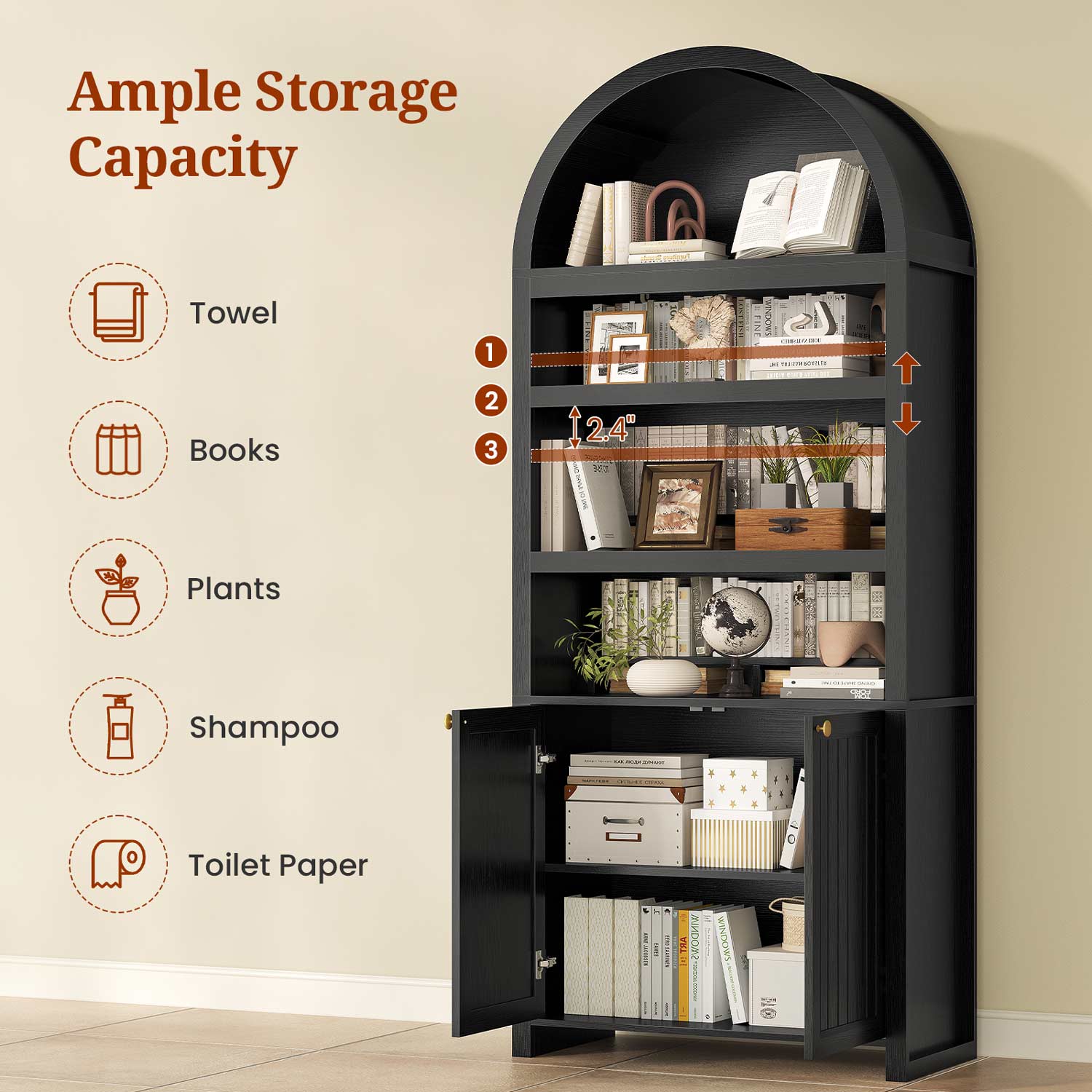 Serve numerous roles throughout your home as a living room library, kitchen pantry organizer, bathroom storage unit, or entryway display piece. Its adaptable design and neutral styling enable seamless integration into diverse environments, effortlessly meeting storage demands across different rooms and lifestyles.