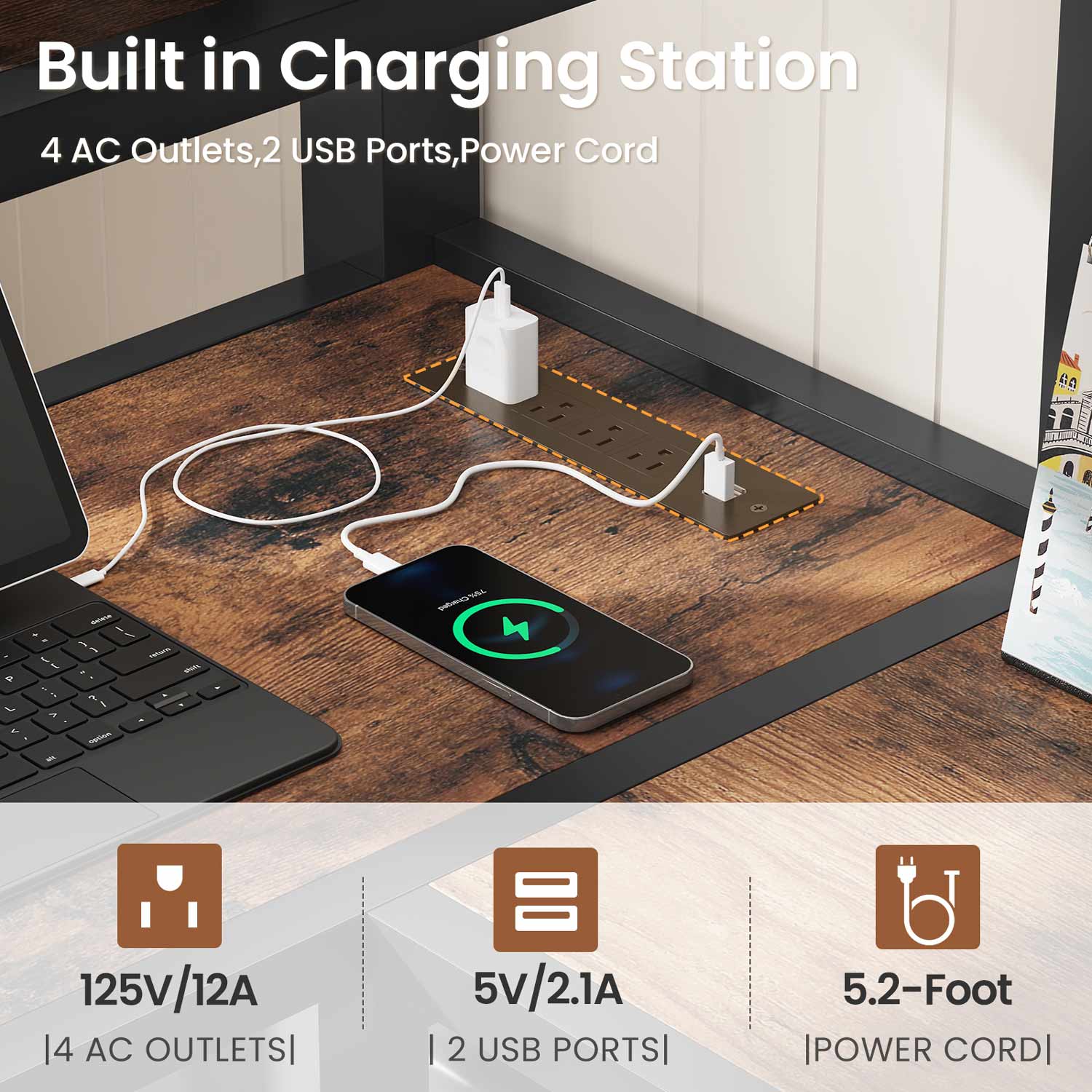 with Power Outlet, 4 Drawers & 3-Tier Storage Shelves, Noise Free