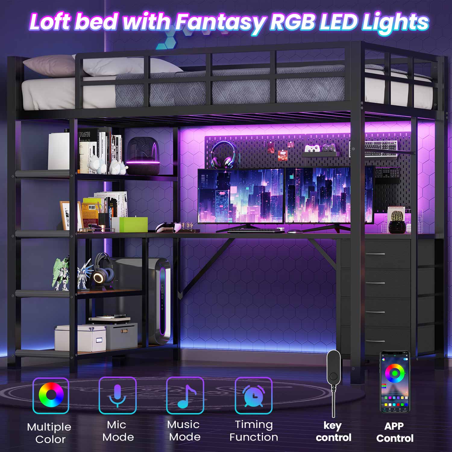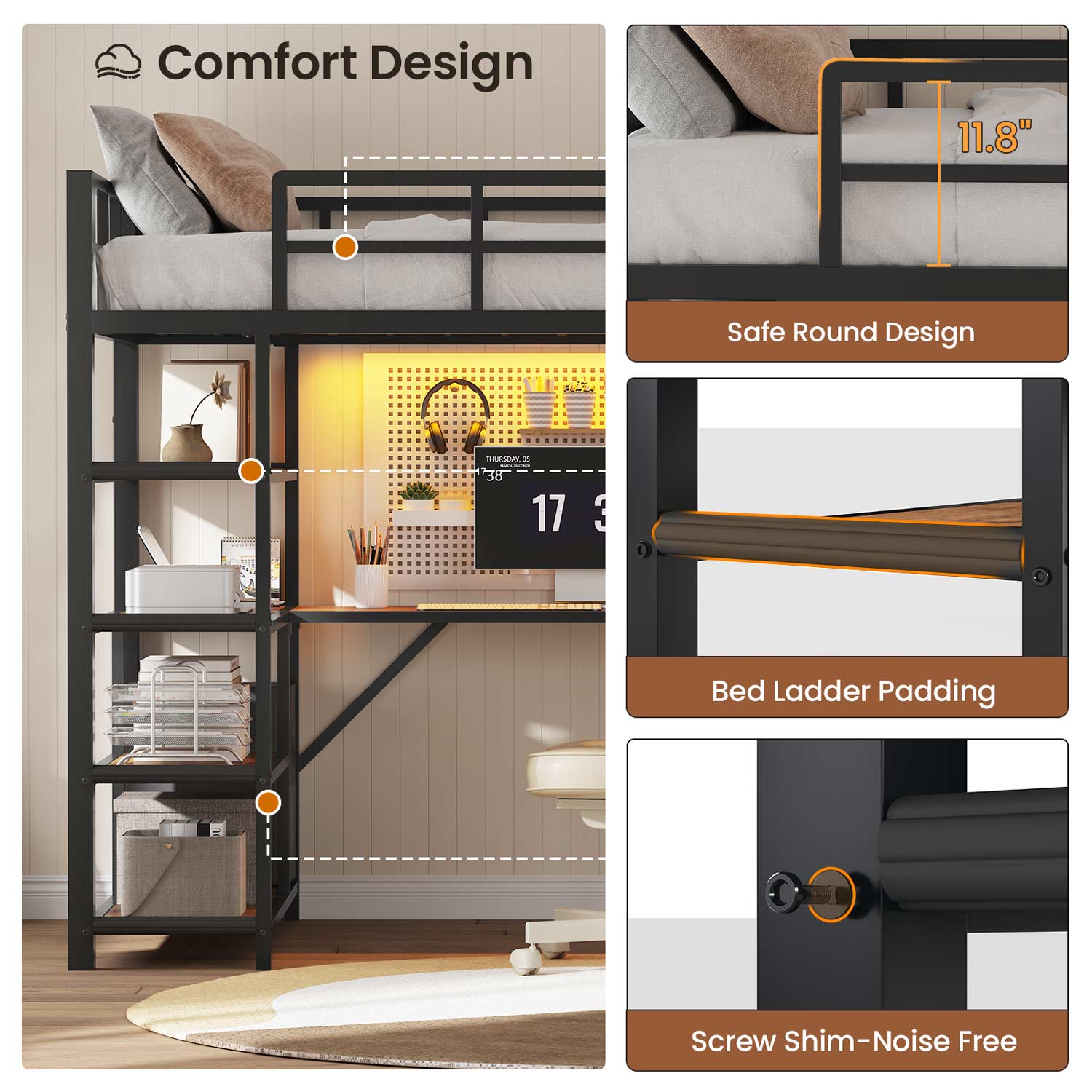 【Loft Bed with L-Shaped Desk and Outlets】The twin size loft bed can be configured as two separate spaces. While satisfying rest, the 59” space under the top bunk bed provides more personal space for work or leisure. Built-in L-shaped study desk and a charging station in front of the desk, ensuring your electronic are always charged.